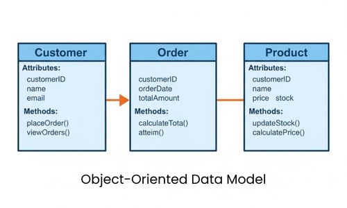 Object-Oriented Data Model में Data को Objects के रूप में Store किया जाता है, बिल्कुल वैसे ही जैसे Object-Oriented Programming (OOP) में होता है।