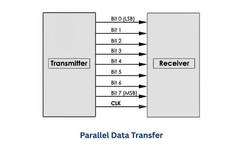 मतलब अगर 8-bit data भेजना है, तो 8 अलग-अलग wires के माध्यम से 8 bits एक ही clock cycle में भेजे जाते हैं।