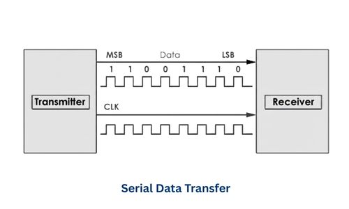 Serial Data Transfer वह method है, जिसमें data को एक समय में एक bit (1 bit at a time) के रूप में एक device से दूसरे device तक भेजा जाता है।