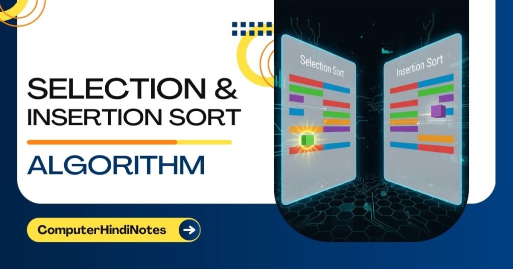 Selection Sort एक comparison-based sorting algorithm है, जिसमें हम array / list के elements को ascending या descending order में arrange करने के लिए हर step पर minimum (या maximum) element चुनते हैं और उसे उसकी correct position पर swap कर देते हैं।