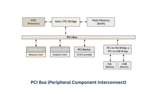 - PCI (Peripheral Component Interconnect) Bus internal devices (Graphics Card, Sound Card, NIC) को motherboard पर CPU और memory से connect करने के लिए high-speed parallel interface है।