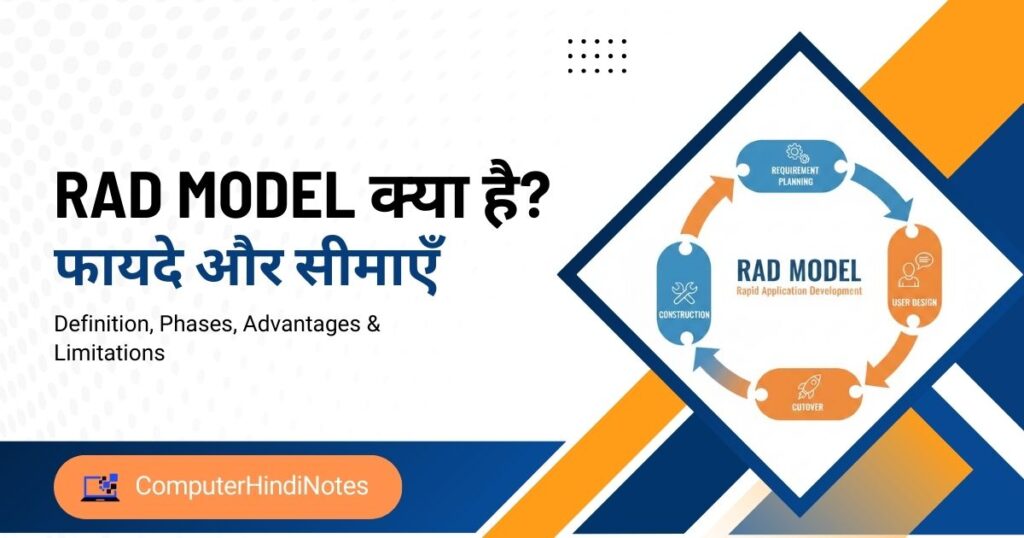 - RAD Model (Rapid Application Development) एक software development model है जिसमें fast development के लिए prototyping, reusable components और user involvement का उपयोग किया जाता है।