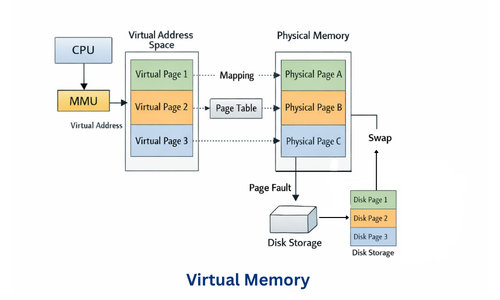 सरल शब्दों में : जब RAM भर जाती है, तो system secondary storage (Disk) को extra memory की तरह उपयोग करता है — इसे ही Virtual Memory कहते हैं।